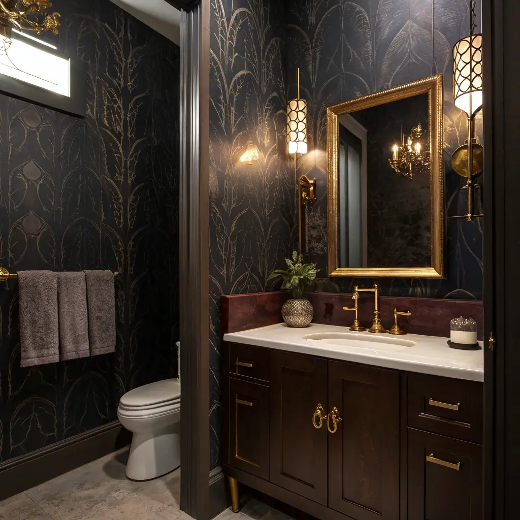 Ready to embrace your dramatic side? Moody dark peel and stick wallpaper creates bathrooms that feel like luxurious retreats. Think deep navies, rich emeralds, dramatic blacks, and sultry charcoals.