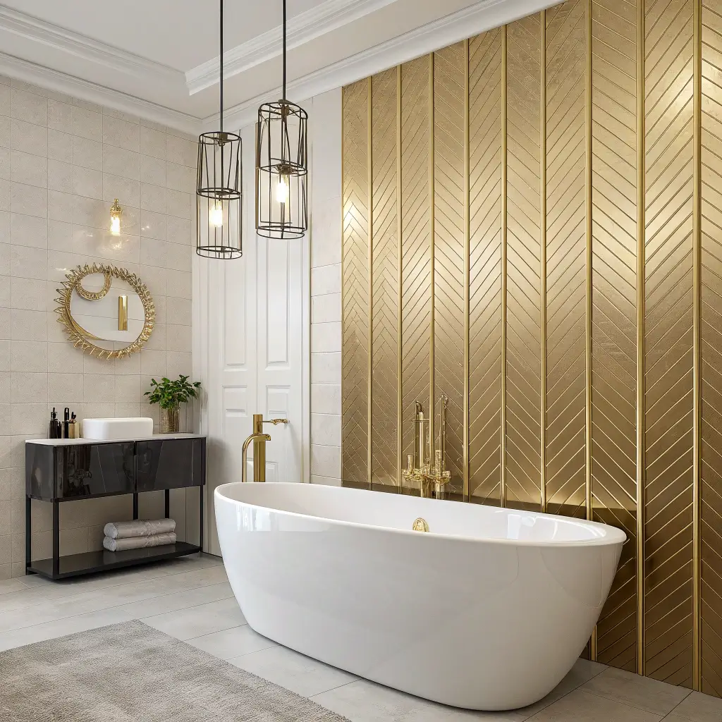 Want to add instant glamour to your bathroom? Metallic and gold peel and stick wallpaper delivers luxury without the luxury price tag. We’re talking shimmering finishes that catch light and make even basic bathrooms feel expensive.