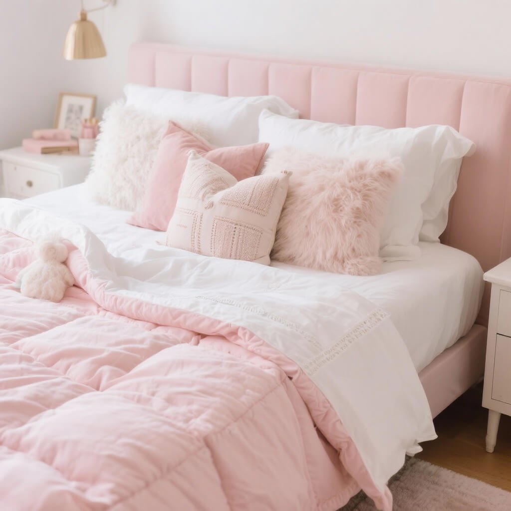 Start with crisp white sheets as your base. I always go for at least 400-thread count because, let’s face it, we spend a third of our lives in bed. Add a soft pink duvet or comforter, then throw in some textured white pillows. The contrast creates visual interest without overwhelming the eye.