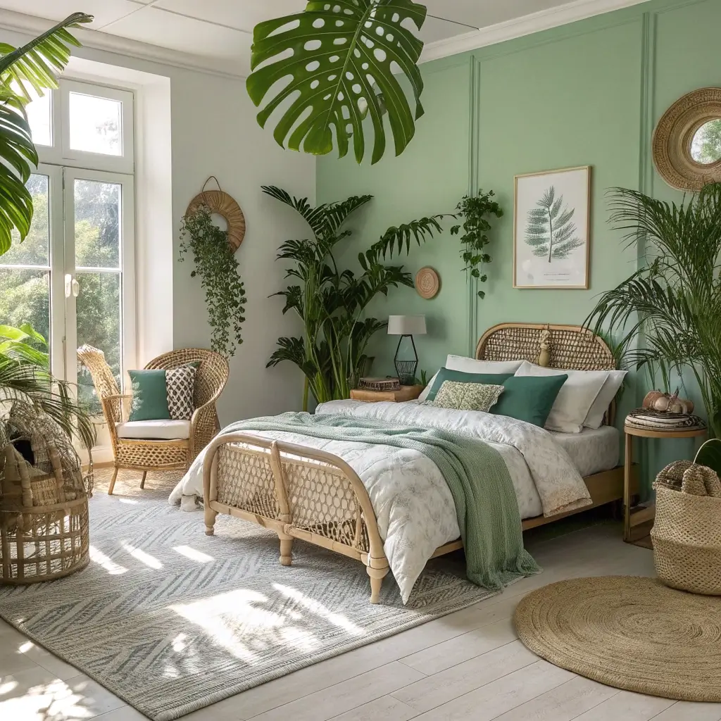 Tropical bedrooms lean into bold leaf shapes, varying shades of green, and plants that scream “paradise.” This isn’t about subtlety—it’s about making a statement.