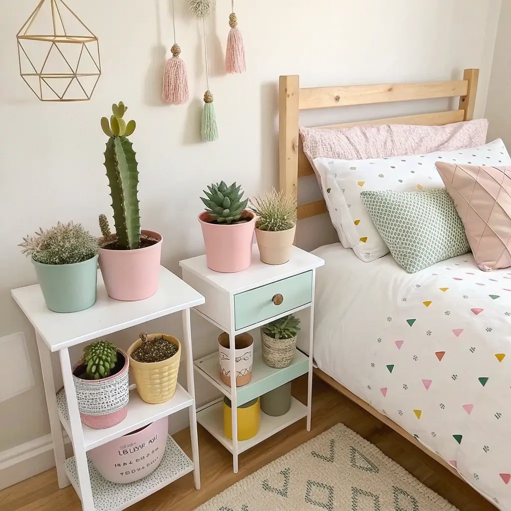 - Bedside plant trios: Three small plants in coordinating pots flanking your lamp