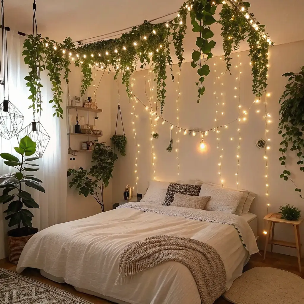 14. Plant & Fairy Lights Bedroom Decor