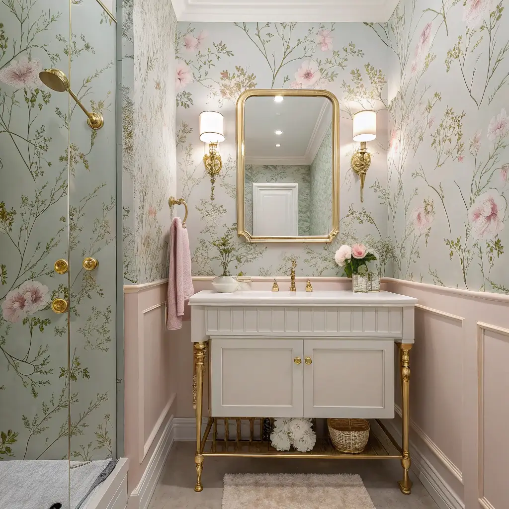 Match your floral wallpaper to your existing fixtures—or use it as an excuse to upgrade them. A pink-toned floral looks stunning with brass fixtures, while blue-green botanicals pair beautifully with chrome or nickel finishes.