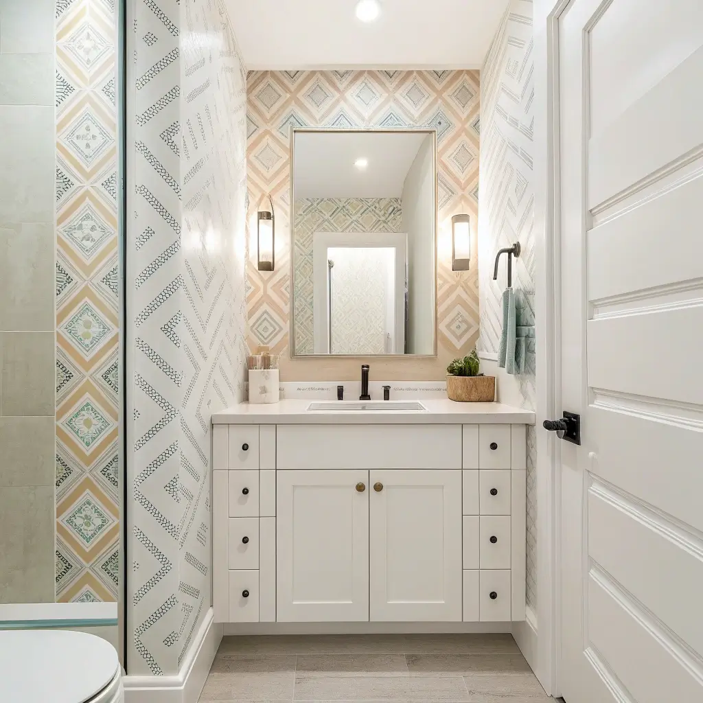 Geometric patterns span every design era and style. Art deco geometrics feel glamorous and sophisticated, while mid-century patterns add retro charm. Modern abstract geometrics keep things fresh and contemporary. Choose based on your home’s overall vibe—or use the powder room to experiment with something completely different.