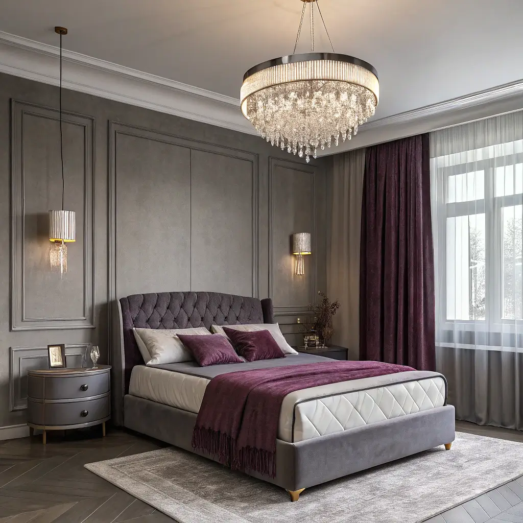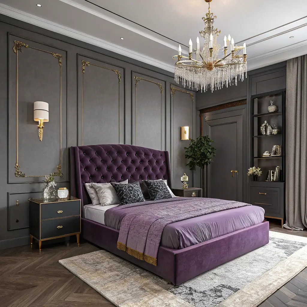 Here’s where people mess up: too much glamour becomes tacky real fast. Keep your walls simple grey, let your purple live in your soft furnishings, and choose one or two truly glamorous pieces as focal points. Your bedroom should feel special, not like a furniture showroom exploded.
