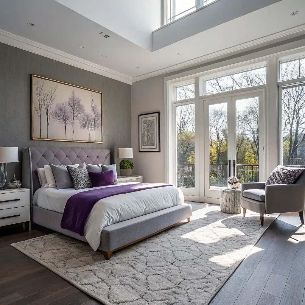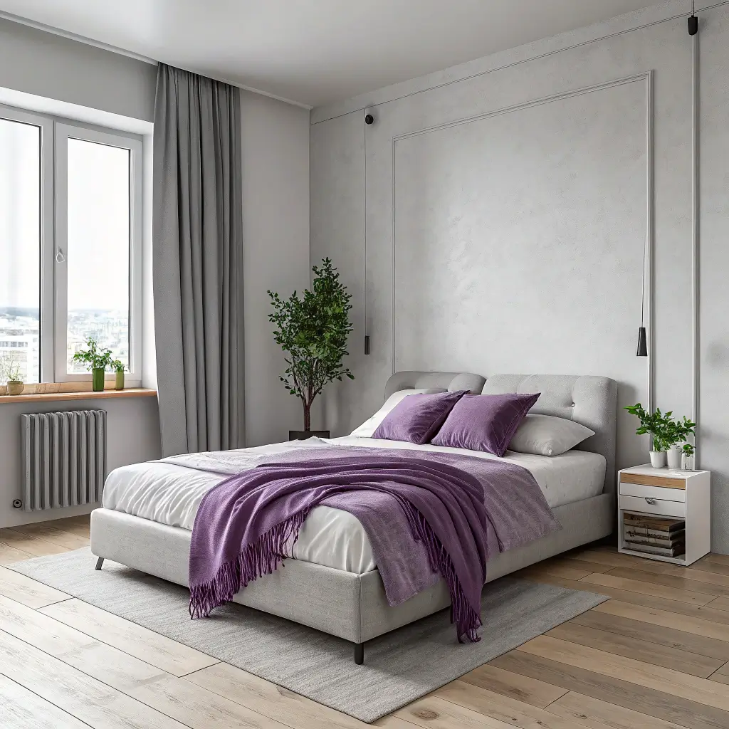 Last but not least, the monochrome grey bedroom with strategic purple pops. This approach gives you maximum flexibility – purple can come and go as trends change, but your grey foundation stays timeless.
