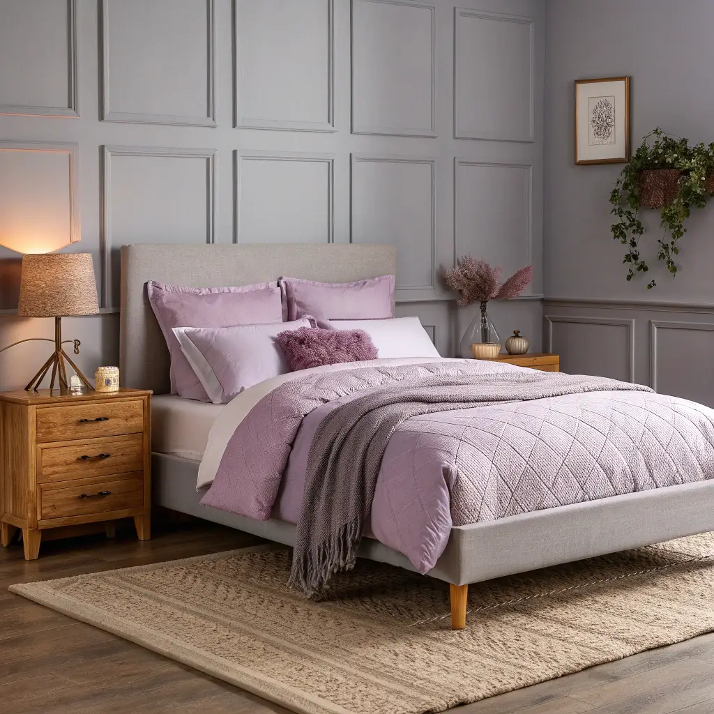 Start with lilac sheets, add a grey duvet, then top with a lighter lilac throw. Mix in white pillows for breathing room. The gradual color transition creates depth without chaos.