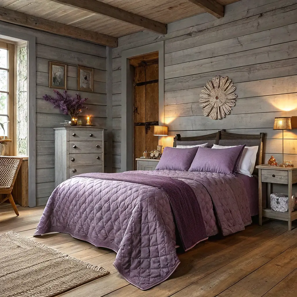 Mix rough with smooth: weathered grey wood furniture with soft purple cotton, grey stone accents with plush purple rugs. The contrast keeps things interesting without losing that rustic charm.