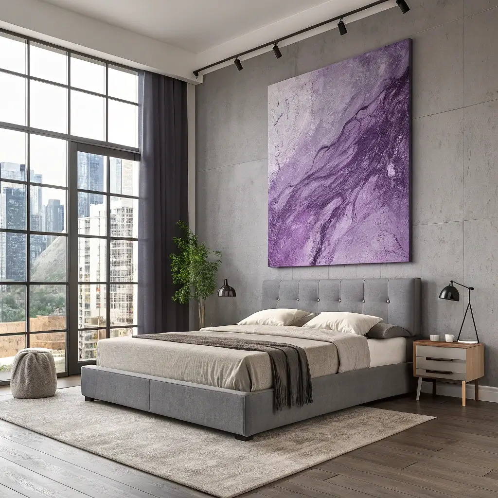 Purple artwork in a contemporary grey bedroom? Chef’s kiss. Art becomes your color story without committing to purple furniture or walls you might regret later.