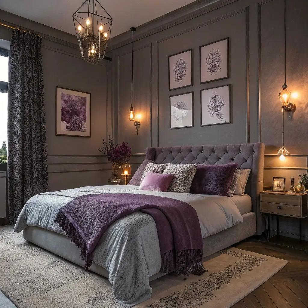 Romance doesn’t require red roses and heart-shaped everything. Purple accents in grey bedrooms create sophisticated romance that feels grown-up and genuine.