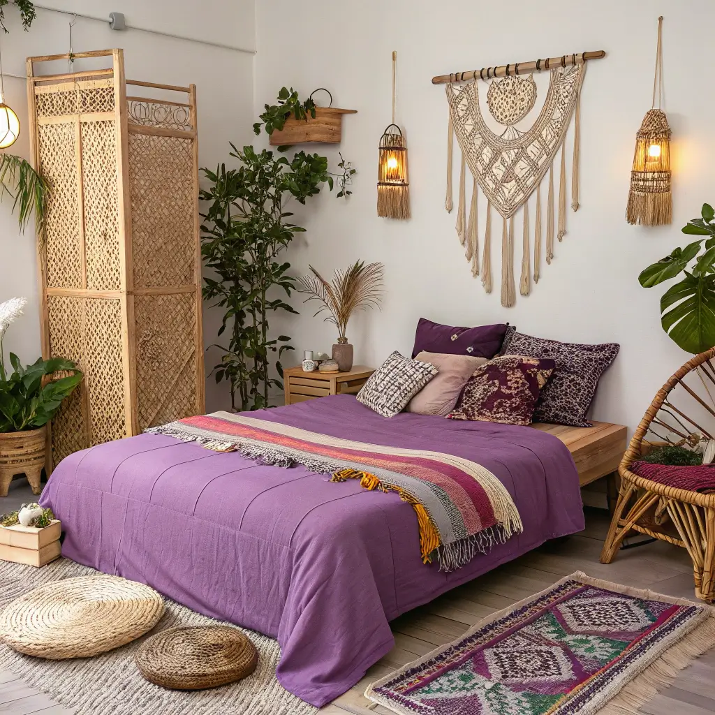 • Textiles everywhere: Moroccan rugs, macramé wall hangings, layered throw blankets in purples and complementary colors