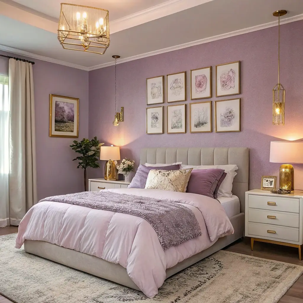 The key here is layering. Don’t just slap lavender paint on the walls and call it a day. Build the cozy factor with plush rugs, soft lighting, and those little gold details that catch the light.