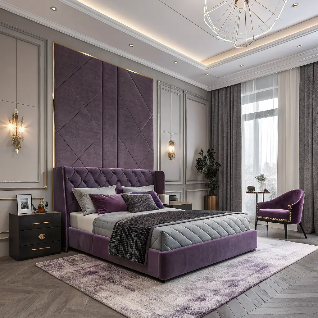 • Furniture: Grey upholstered headboard, purple accent chair