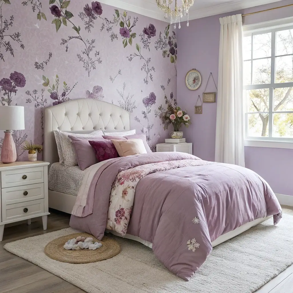 • Wall treatment: A subtle violet wallpaper or soft paint enhances the dreamy effect