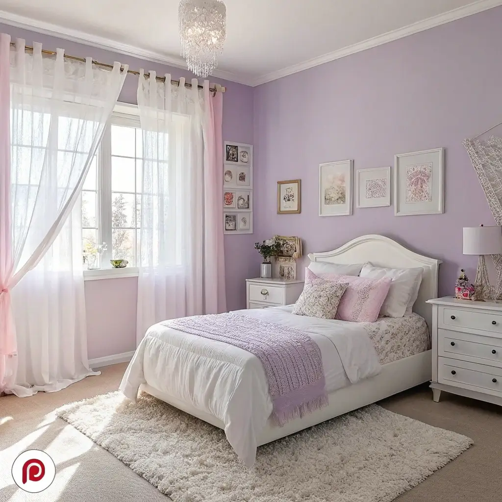 • Walls: Either soft lilac walls with white trim or white walls with lilac accents