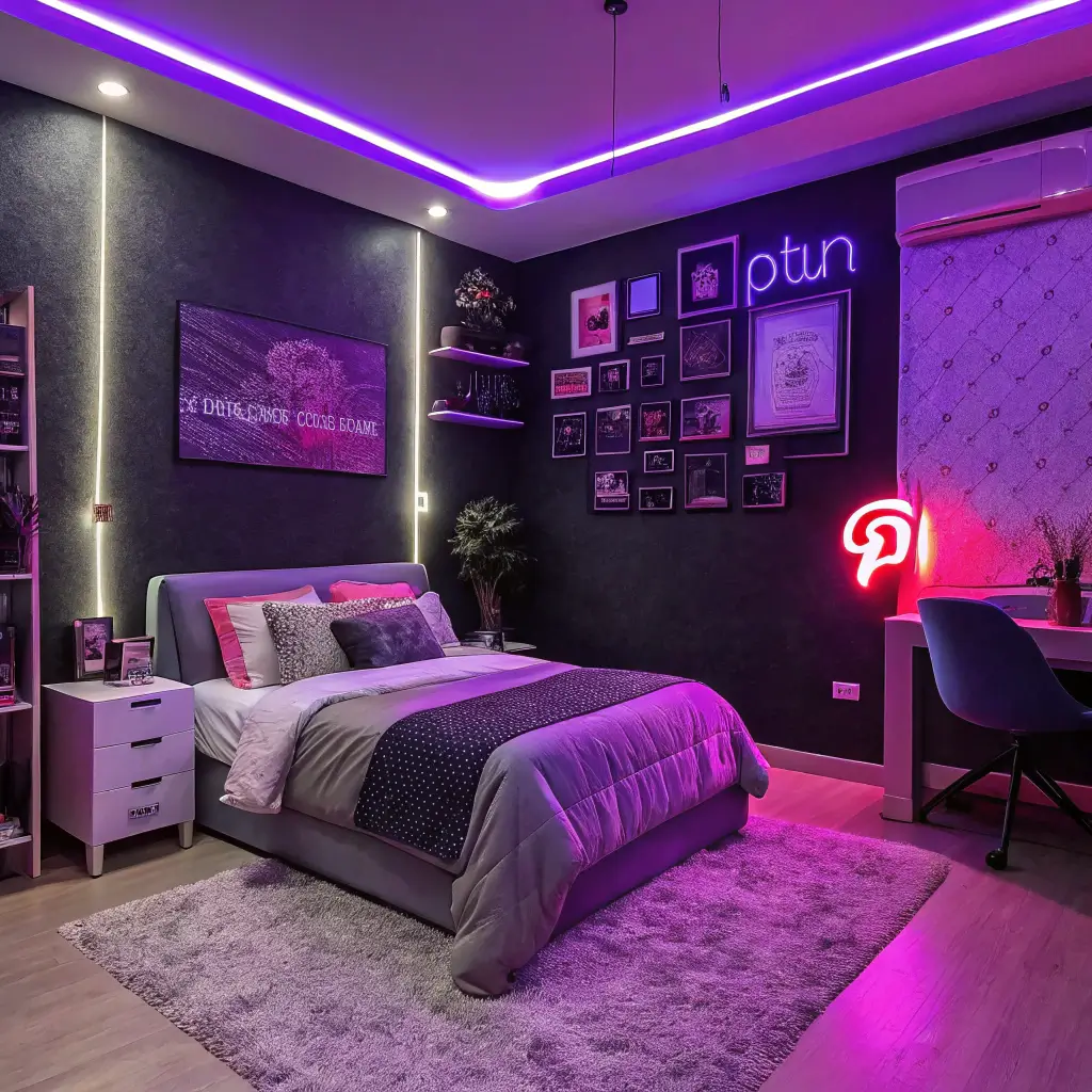 Okay, this one’s for my bold friends who scroll past traditional aesthetics and crave something with edge. Purple neon accents bring energy, modernity, and a touch of rebellious spirit to your bedroom. 🙂
