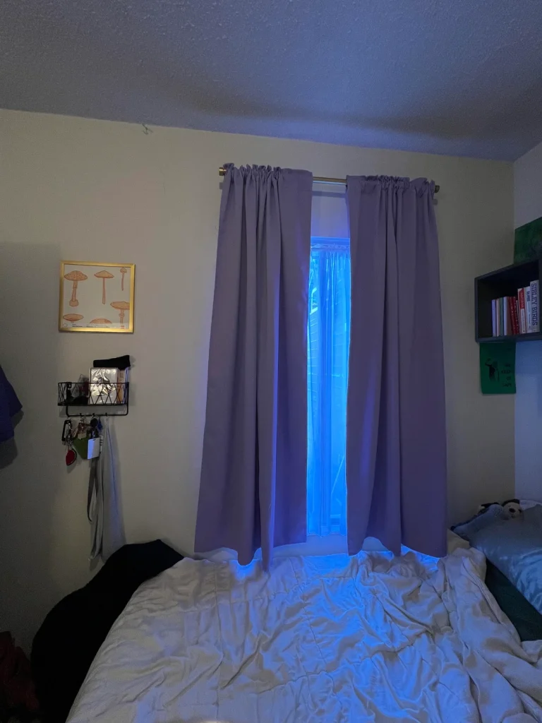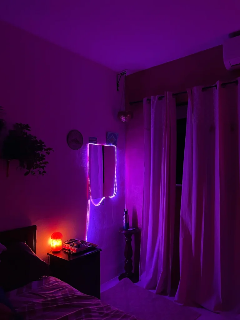 The curtains are floor-length and richly coloured, framing a corner of the room where a neon LED mirror and warm orange lamp sit on the bedside table. The purple lighting washes over the walls and ceiling, creating a moody, immersive atmosphere. It’s dramatic, but it’s also surprisingly cosy. The warm orange lamp balances out the cool purple tones, keeping the space from feeling too one-note.