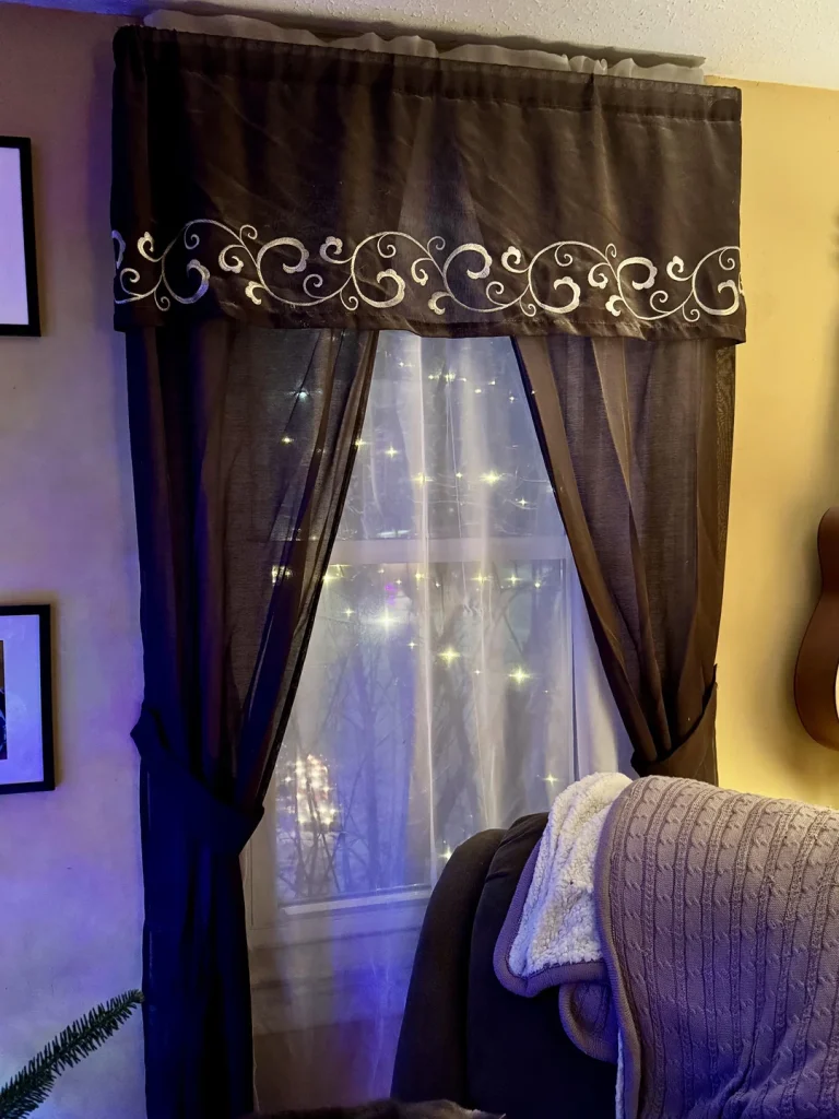 The curtains are a deep brownish-purple with a decorative valance at the top featuring an embroidered swirl pattern. Behind the main curtains, there’s a sheer white layer with fairy lights woven through, creating a soft, twinkling glow. The combination of textures—heavy drapes, delicate sheers, and tiny lights—adds so much visual interest without cluttering the space.