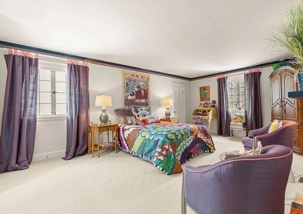 The curtains are long and flowing, hanging from simple rods and framing large windows that let in plenty of natural light. The purple here is muted—not too bright, not too dark—so it blends easily with the rest of the room’s colourful decor. The bedding features a bold, artistic print with blues, greens, and reds, and the furniture includes vintage-style pieces, purple leather chairs, and lots of personal touches.