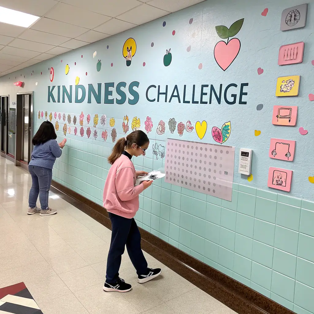 I set up one of these in an elementary school, and within a week, kids were racing to complete kindness challenges. We created tear-off challenge strips attached to the walls at kid height. Each strip contained a simple act of kindness they could complete that day. Think “Give someone a genuine compliment” or “Help a classmate pick up dropped books.”