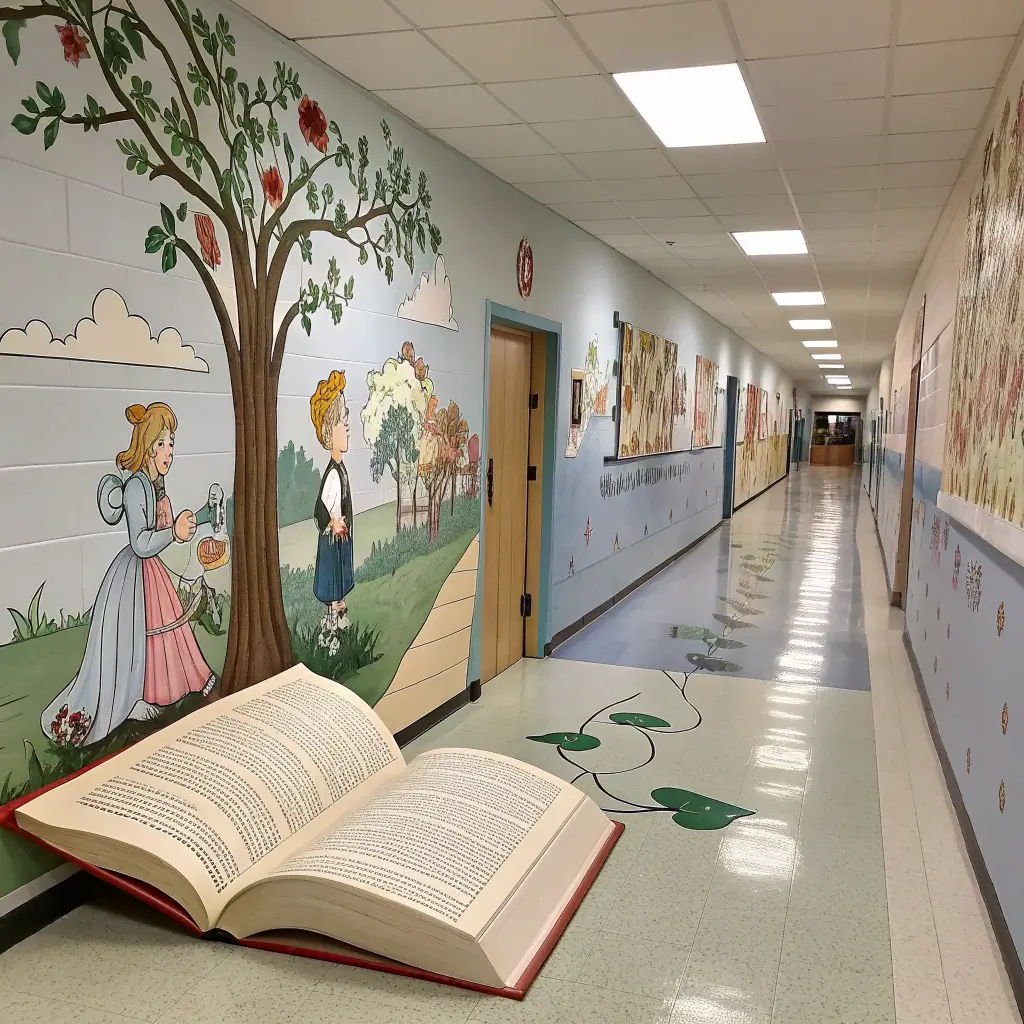 Transform your hallway into a page-turning adventure! This concept brings beloved stories to life through immersive decorative scenes that change as students walk through different sections.