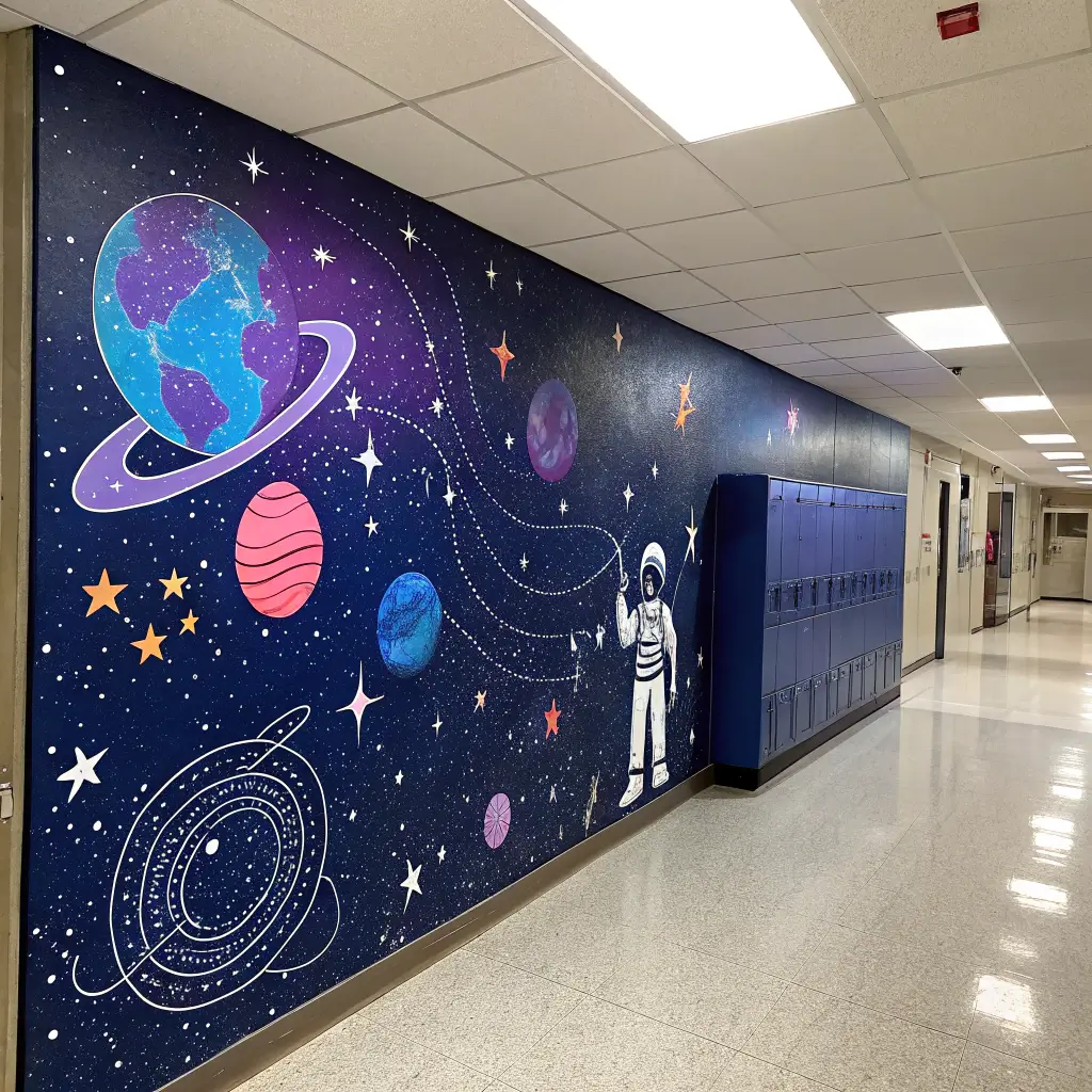 Houston, we have an awesome hallway! Transform your corridor into an intergalactic journey with a space exploration theme that makes students feel like astronauts heading to class. Glow-in-the-dark elements make this design especially magical.