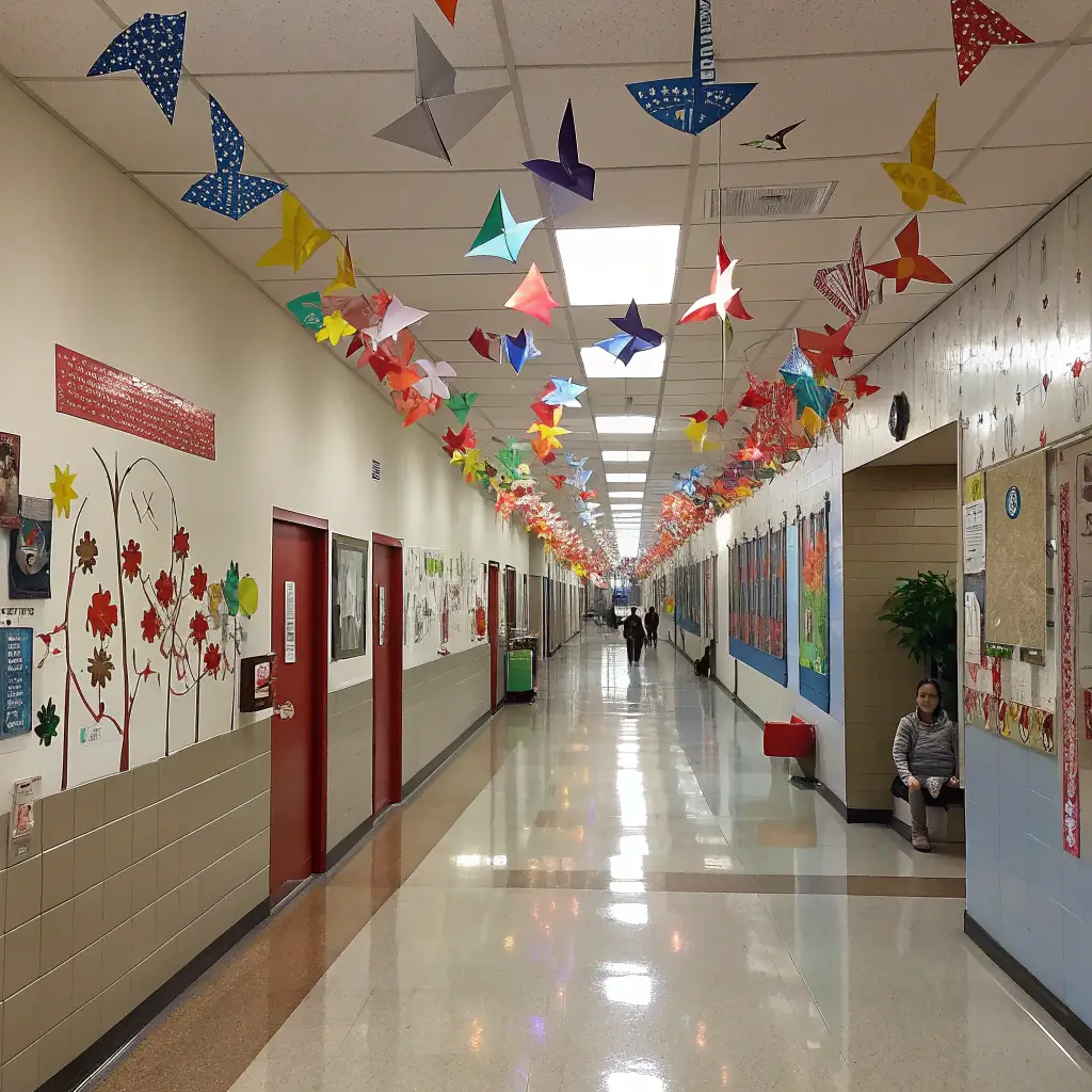 Flat displays are fine, but 3D elements make hallways come alive. Ever walked past a ceiling covered in hanging paper butterflies? Or a wall where paper flowers literally pop out at you? That’s the stuff kids remember.