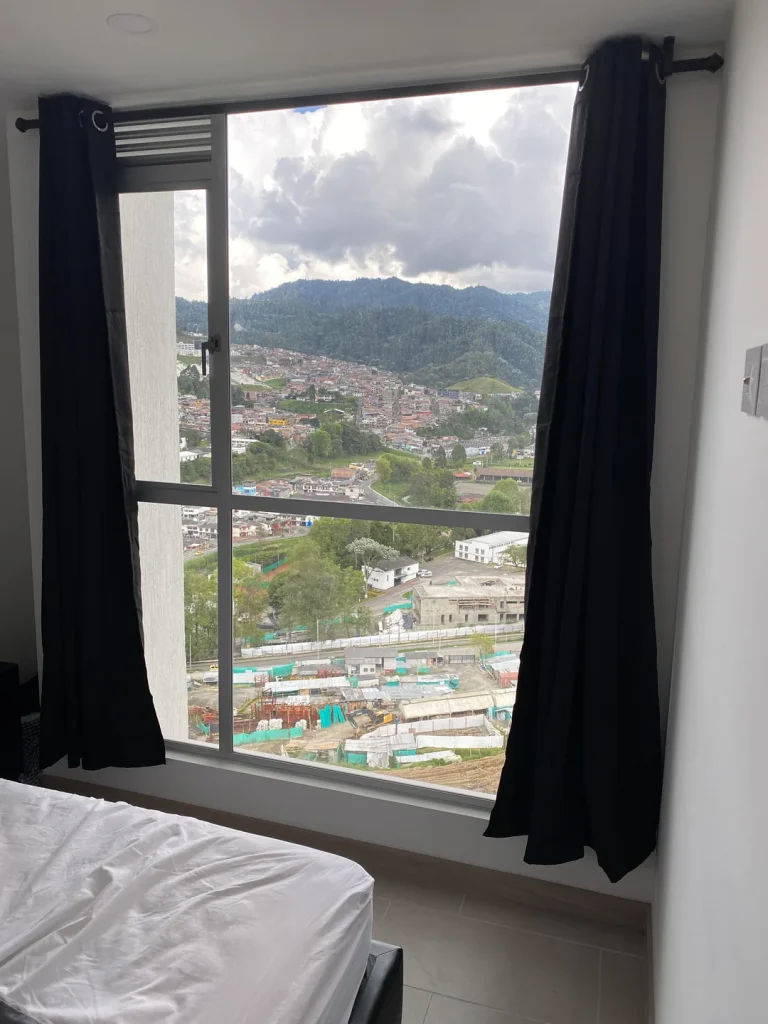 Here’s a bedroom where the curtains frame something worth looking at. Solid black short curtains hang on either side of a large window that overlooks a hilly cityscape. The view is the star, and the curtains are smart enough to stay out of the way.
