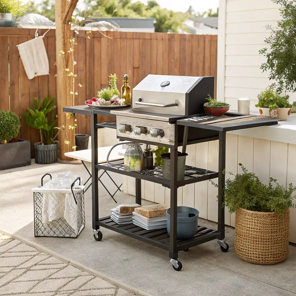 Think of this as a mobile command center for outdoor entertaining. A rolling bar cart adapted for cooking duty brings flexibility that fixed setups can’t match.