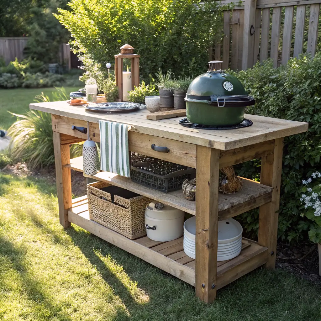 I repurposed an old potting bench (garage sale find for $30) and added a few modifications. A lower shelf holds plates and serving dishes, while hooks on the side keep tools within reach. The weathered wood look means you don’t stress about every little stain or scratch – they add character.