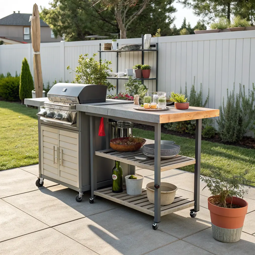 Who says your outdoor kitchen needs to stay put? A portable cart setup gives you ultimate flexibility – grill on the patio today, by the pool tomorrow.