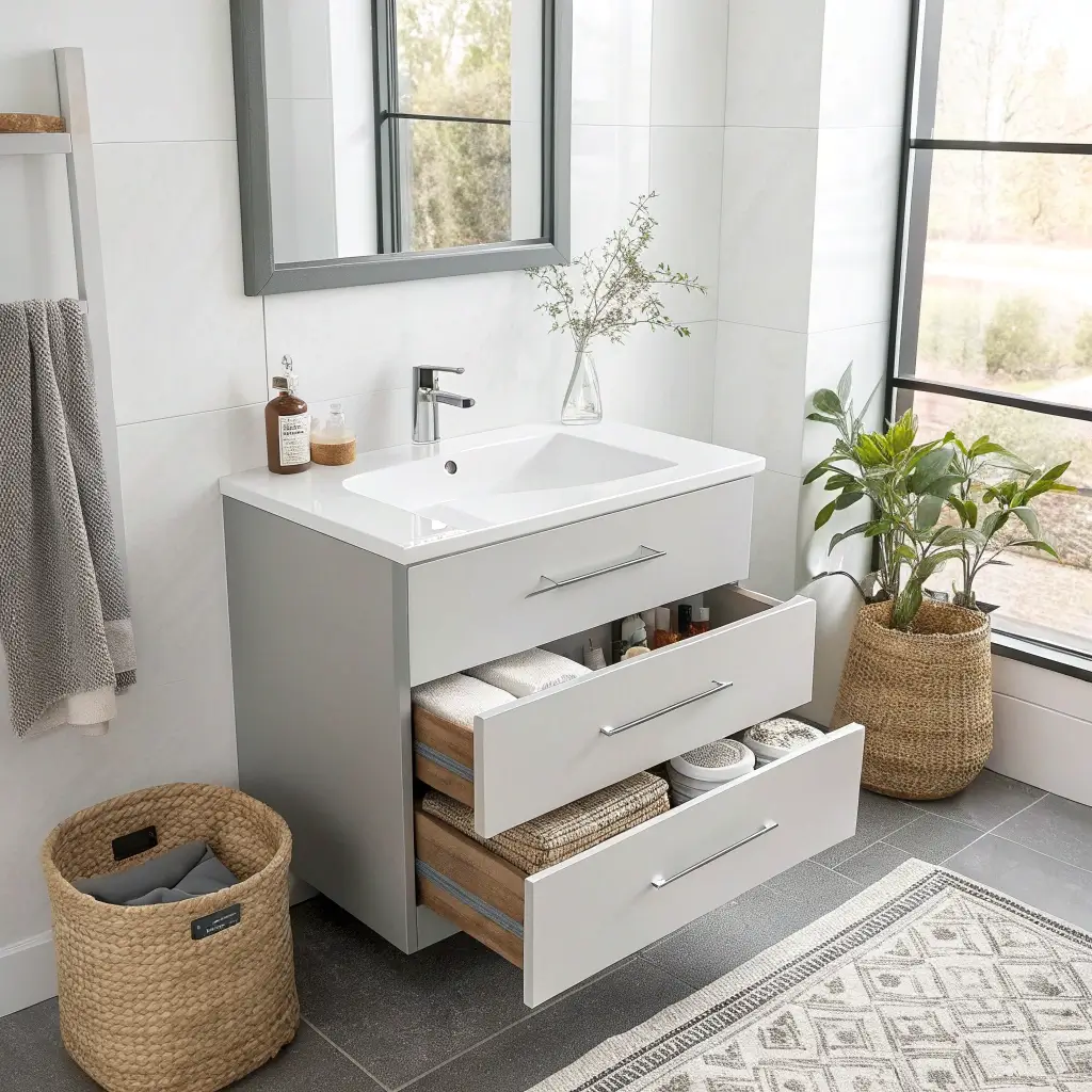 Look for linen cabinets or storage towers that are narrow but tall—think 12-18 inches wide but 60+ inches high. These squeeze into spaces that would otherwise remain empty while providing substantial hidden storage.