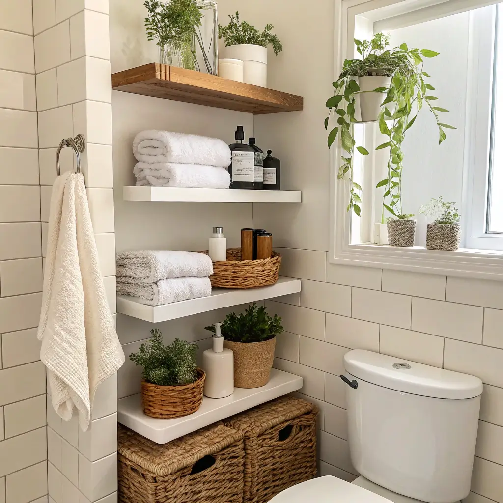 That wall space above your toilet? Prime vertical storage territory. Options include: