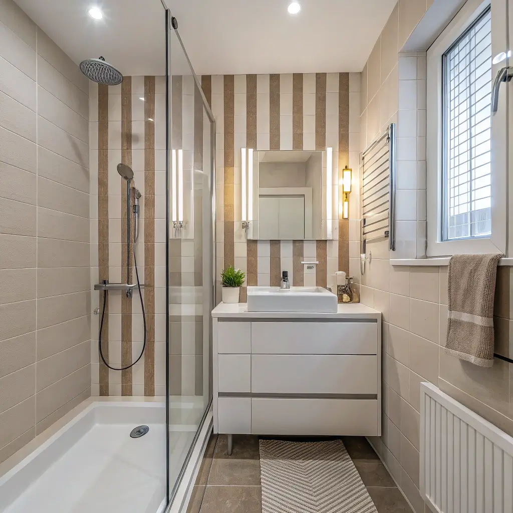 Arranging tiles in vertical stripes naturally draws the eye upward. This simple trick can make a bathroom with low ceilings feel significantly more spacious. And unlike horizontal stripes (which can make walls look wider but ceilings lower), vertical lines work with your space’s challenges rather than against them.