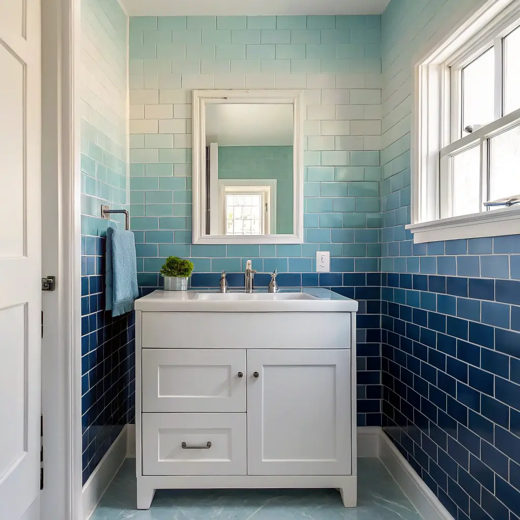 Gradient or ombre tile walls transition from one shade to another, creating a visual flow that’s both soothing and interesting. Think dark blue at the bottom fading to pale blue at the top, or deep green transitioning to mint.