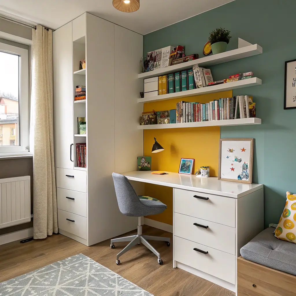 Corner desks are your best friend in small rooms. They tuck into otherwise dead space and provide surprising surface area. Look for ones with built-in shelving going up the walls – vertical storage strikes again!