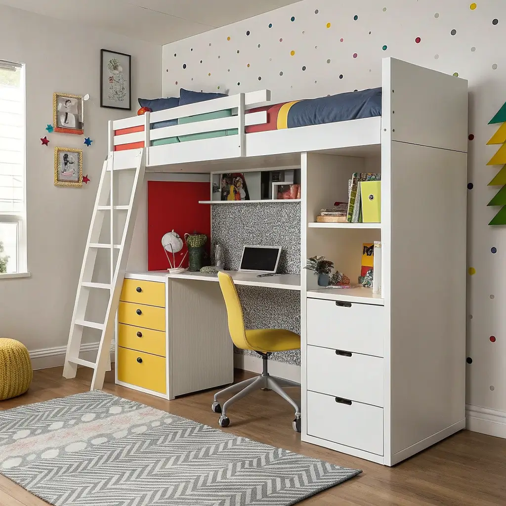 I know what you’re thinking – “But what if he falls?” Modern loft beds come with sturdy guardrails and wide ladder steps that even half-asleep kids can navigate safely. Some even have stairs with built-in drawers. Talk about killing two birds with one stone!
