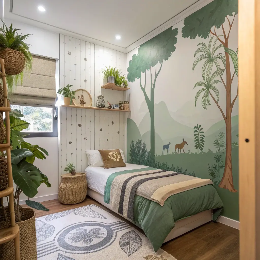 Bringing outdoors inside makes small spaces feel larger and calmer. Nature themes grow with kids – a forest theme at 5 still works at 15, just evolved. Plus, green is scientifically proven to improve focus and reduce stress.