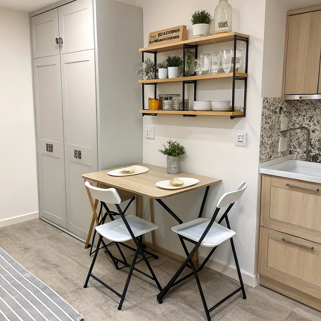 - Wall-mounted fold-down tables that disappear completely when not needed