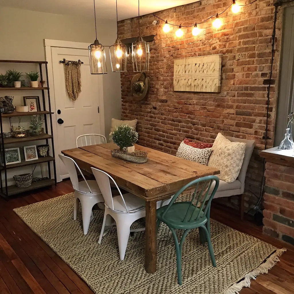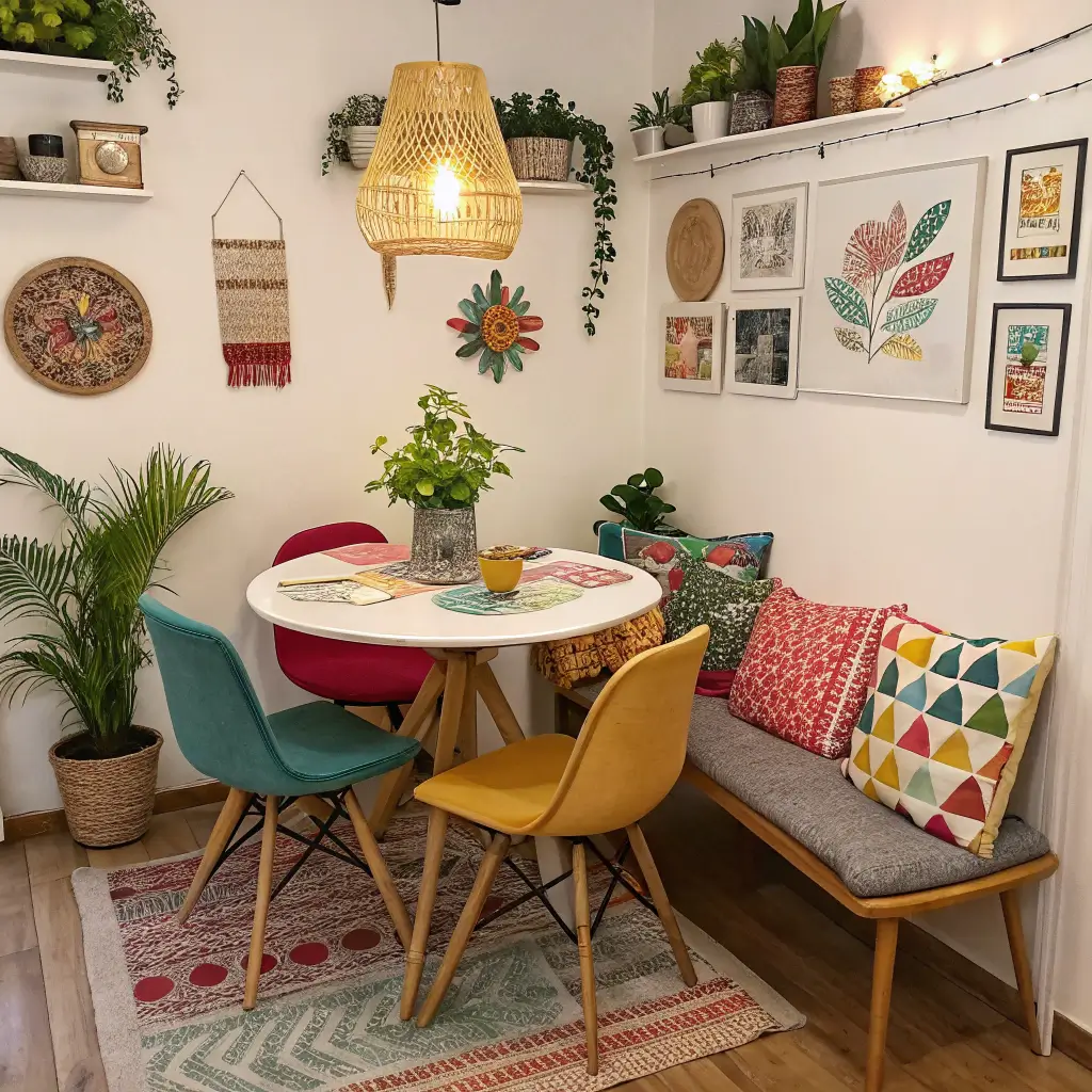 Start with a simple base – neutral table and chairs. Then add boho elements strategically. A macramé wall hanging here, a colorful runner there. My dining area features one stunning Moroccan pendant light that sets the entire mood without cluttering the space.