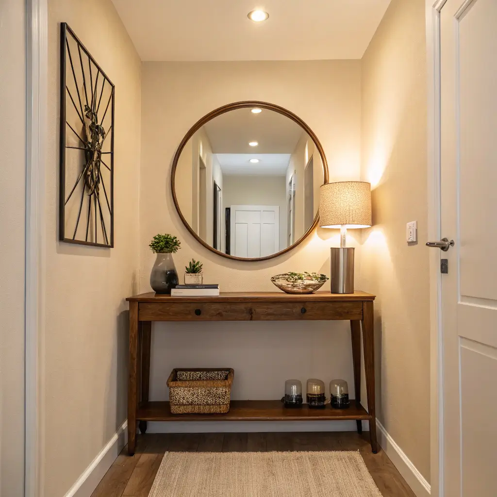 Now, about that accent mirror. Skip the basic rectangle and go for something with personality. Think sunburst designs, geometric shapes, or vintage finds with character. Position it directly above your console, and watch your hallway double in size – visually, at least. Mirrors reflect light and create depth, two things every small hallway desperately needs.