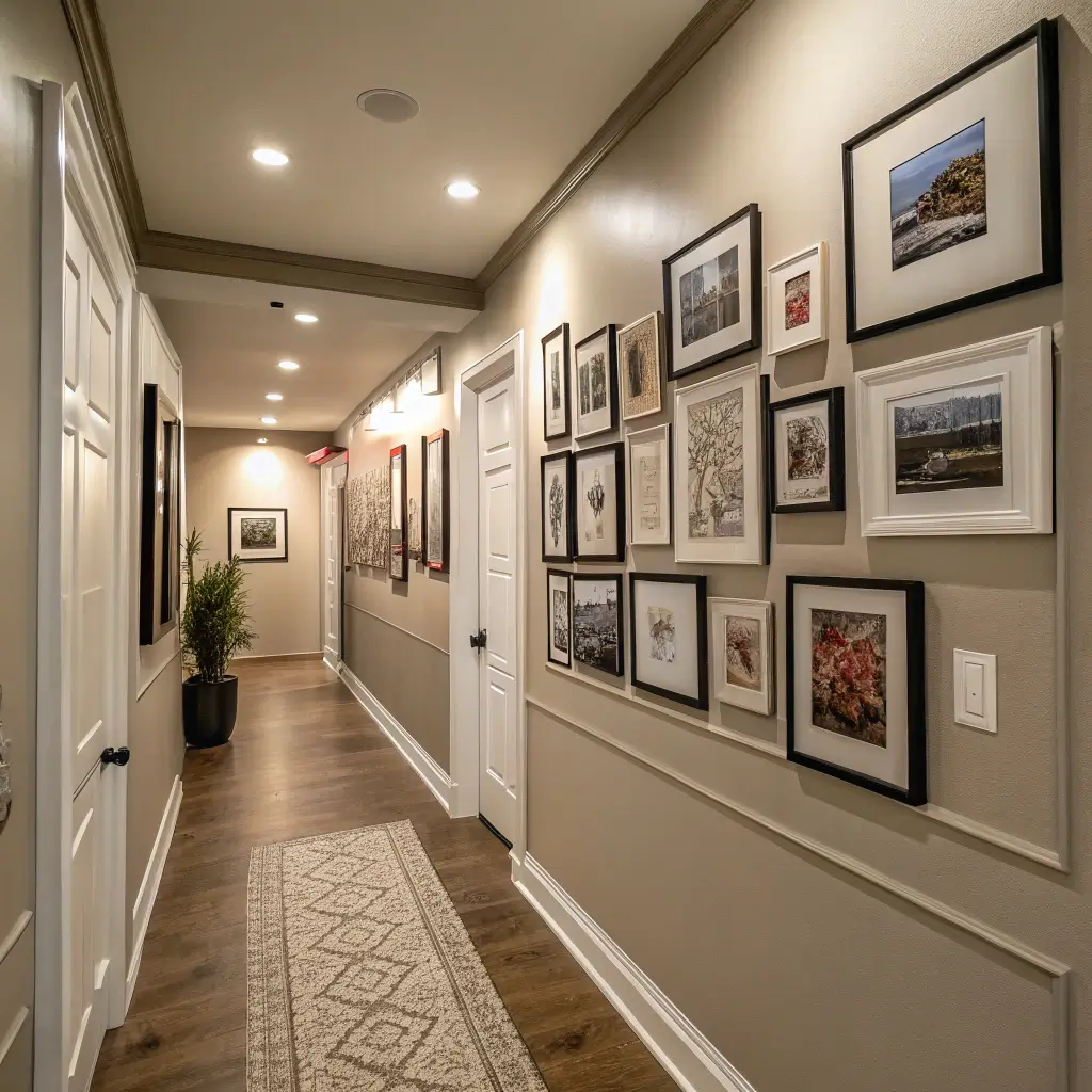 Want to make this even more interesting? Include unexpected elements like small mirrors, wooden letters, or even a tiny shelf within your gallery arrangement. Just remember – this is a hallway, not a museum. Keep frames flush against the wall to avoid shoulder-checking your art every time you pass by.