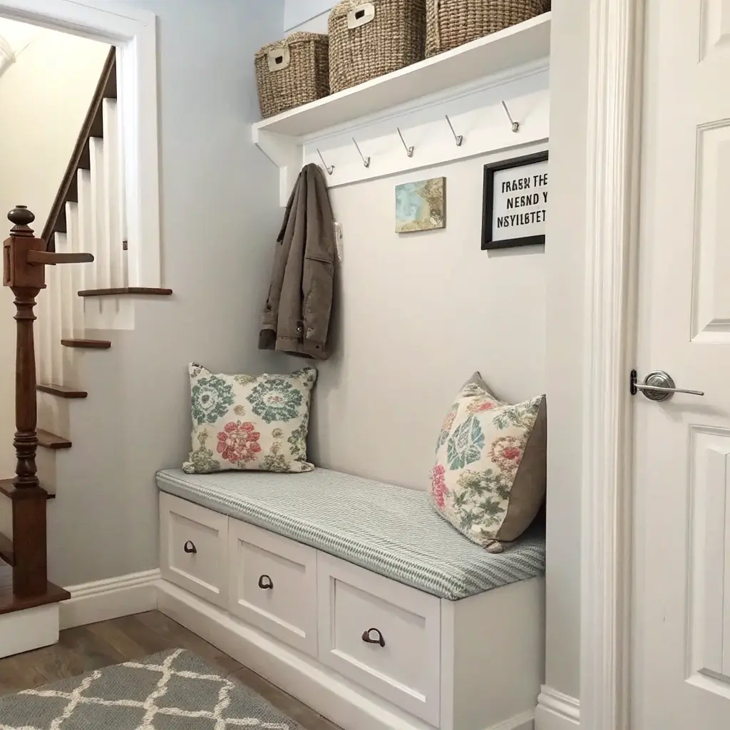 Style it simply. One cushion, maybe a throw pillow if you’re feeling fancy. The bench should enhance your hallway, not dominate it. Mine holds exactly three pairs of shoes underneath in matching baskets because visible shoe chaos stresses me out.