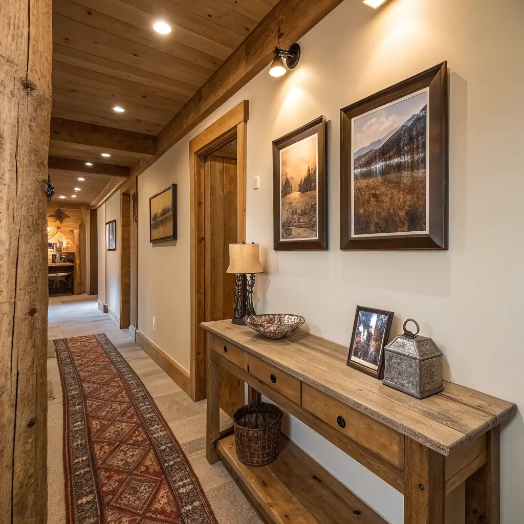 Balance rustic elements with modern touches. Pair barn wood with sleek black frames, or rough hewn shelves with minimalist white walls. The contrast prevents your hallway from feeling like a time capsule.