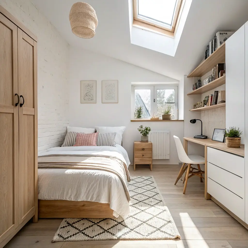 Start with a low-profile bed frame in light oak or birch. Add crisp white bedding with maybe one textured throw blanket. Keep your nightstand minimal—just a lamp and perhaps a small plant.