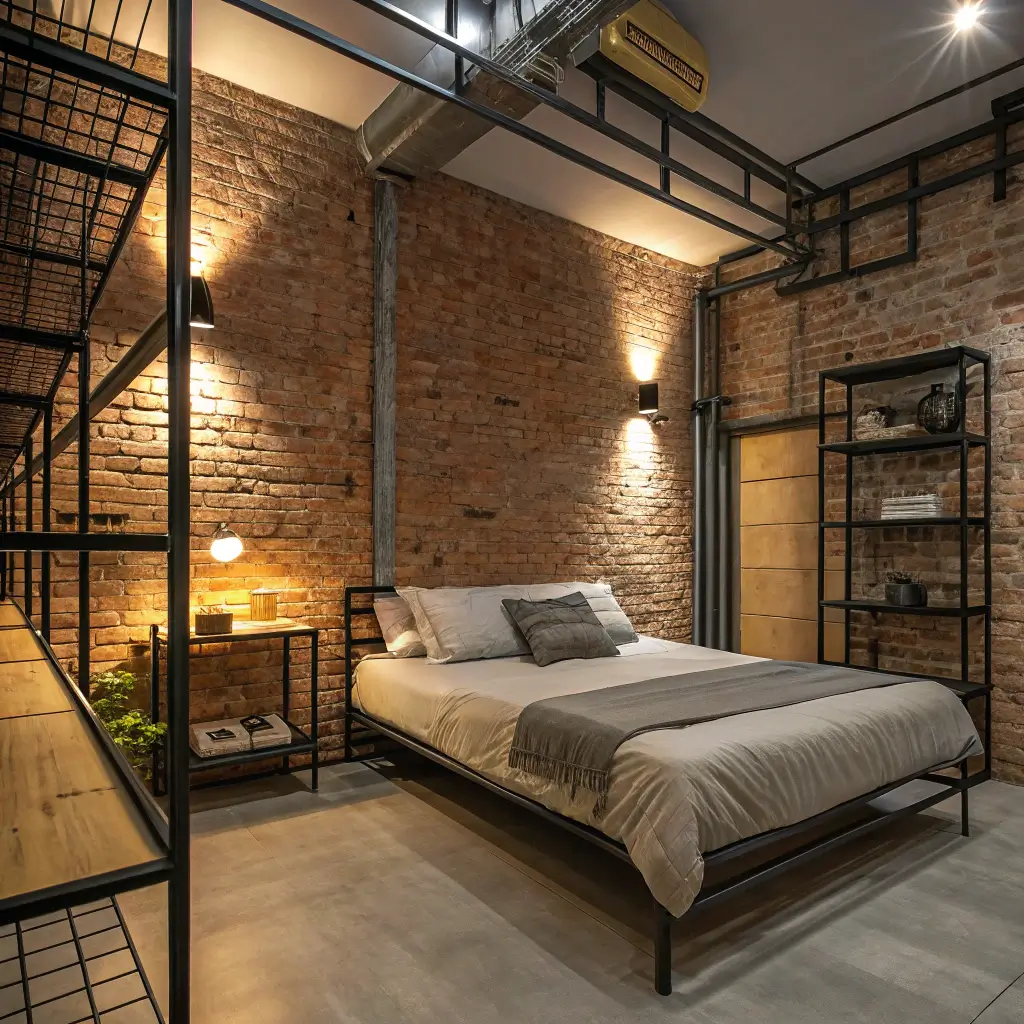 Raw materials: Exposed brick (or brick wallpaper), concrete elements, reclaimed wood, and unfinished surfaces add authenticity.