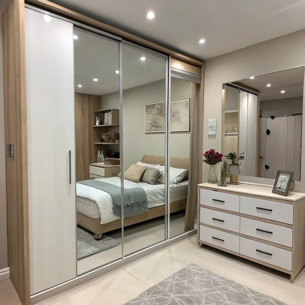 - Mirrored dresser tops or full mirrored dressers multiply storage areas visually