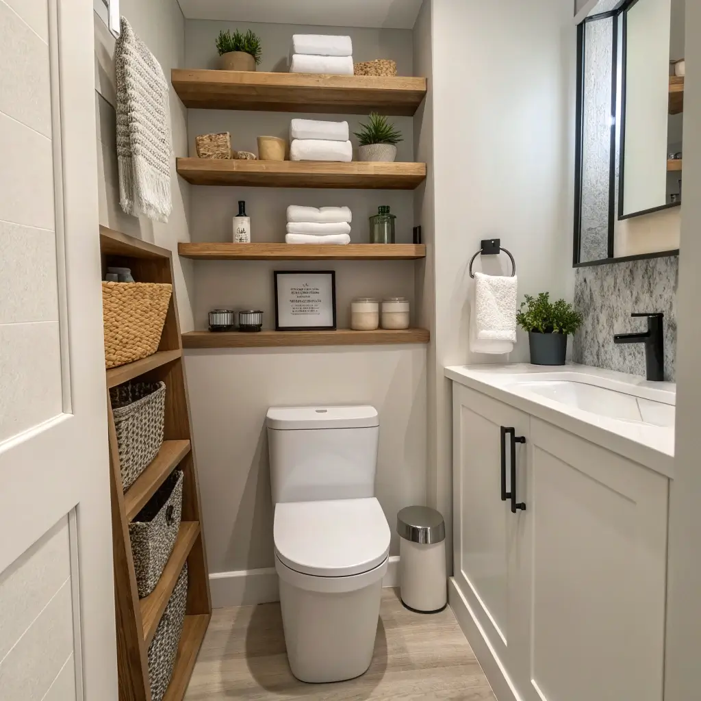 Above the toilet: This vertical real estate often goes completely unused. A slim cabinet, floating shelves, or even a decorative ladder shelf can hold toilet paper, hand towels, and decorative items.