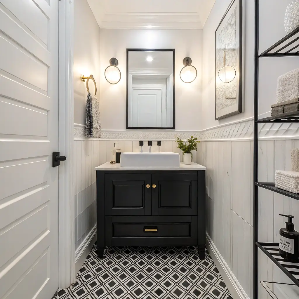 - White walls with black fixtures: Matte black faucets, hardware, and lighting against crisp white walls