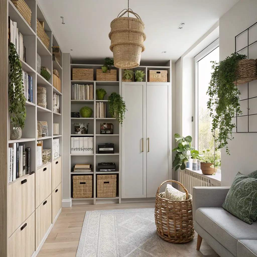 I installed floor-to-ceiling shelving on one wall, and it literally doubled my storage capacity. The key is making it look intentional, not like you’re hoarding books for the apocalypse. Mix open and closed storage to keep things visually interesting.